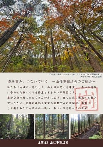 森林所有者様をはじめ、地域の方々に山の恵みや森林整備の様子をお届けする情報誌を不定期発行しています。