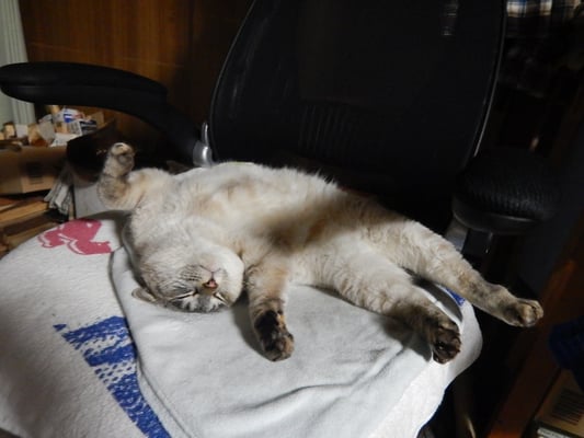 で、あったかいストーブの前で焚き付けを作るのもサイコー。なんだけど、大抵はニャンコどもに特等席を奪われているのでござる。