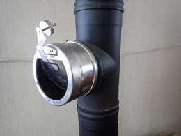 特徴のひとつに、針葉樹の燃焼を穏やかにする仕組みが、煙突の途中にあります。「ドラフトストビライザー」といって、燃えすぎて煙突へ空気が引きすぎる時、自動で調整してくれる調整弁がついています。優れものです。