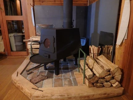 針葉樹もガンガン燃せる鉄板のストーブに2年前に交換。でも熱くなり過ぎないよう注意してます。毎年6t程度の薪を使います。半分は前年に作っておく。ナラ灰は小谷村大網の「くらして」にトチの実のあく抜き用として使ってもらっている。