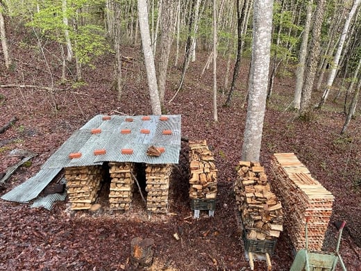 <森の中では乾燥を良くするため薪の内側を上にして重ねる>